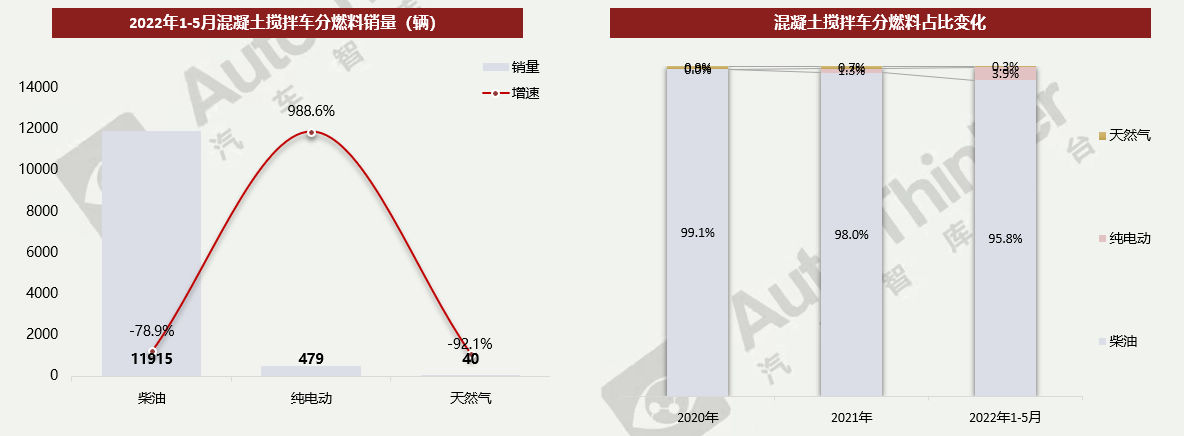 2022年1-5月,燃料结构方面主要集中在柴油机,累计销售11915辆,同比下降78.9%,占据市场95.8%的份额,下降3.2个百分点。