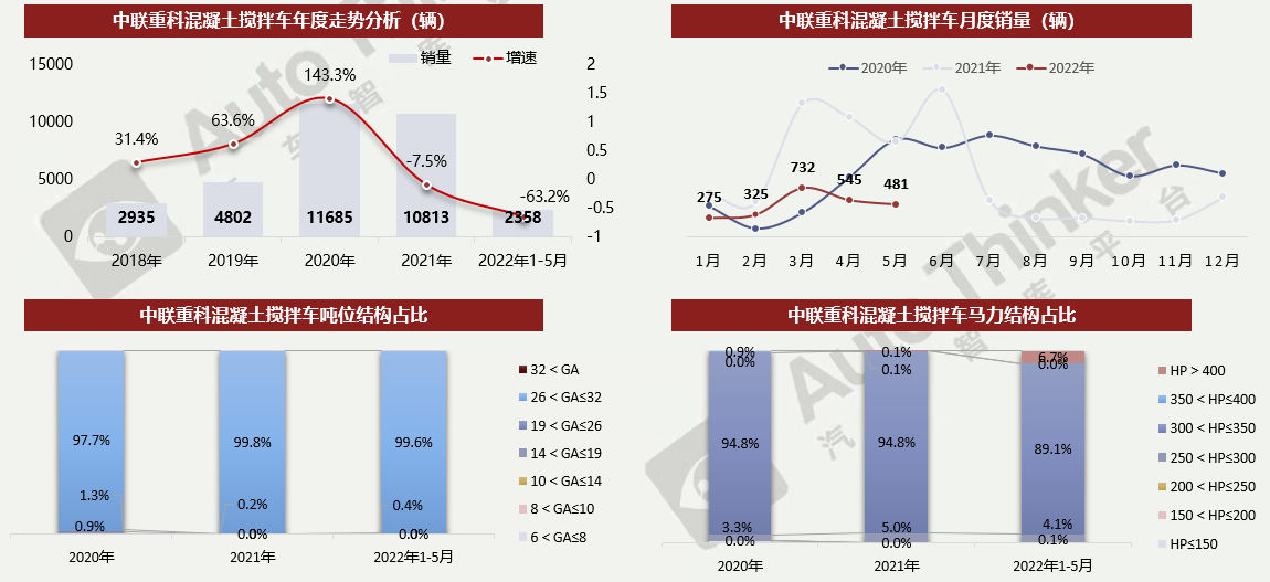 2022年1-5月,中联重科累计销售2358辆,同比下降63.2%;