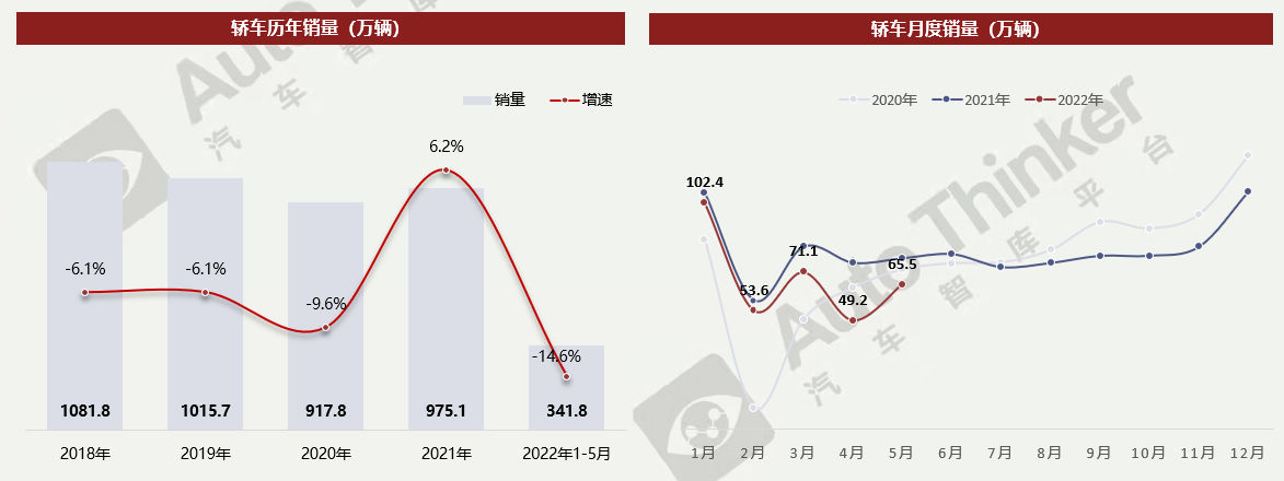 2022年1-5月轿车销量341.8万辆,同比下降14.6%。