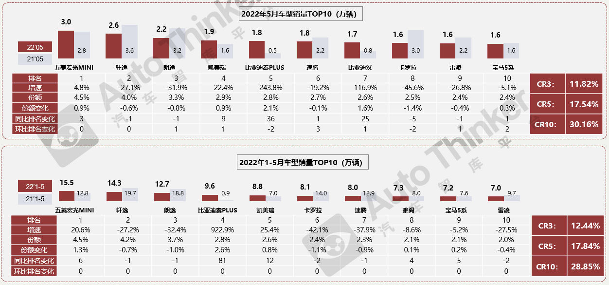 2022年5月轿车市场TOP10车型,五菱宏光MINI、轩逸、朗逸排名前三,其中宏光MINI销售3.0万辆,同比增长4.8%。