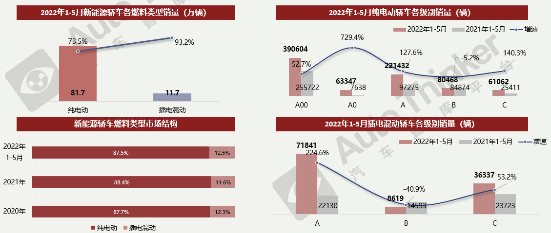 2022年1-5月,纯电动轿车销售81.7万辆,同比增长73.5%;插电混动轿车销售11.7万辆,同比增长93.2%;