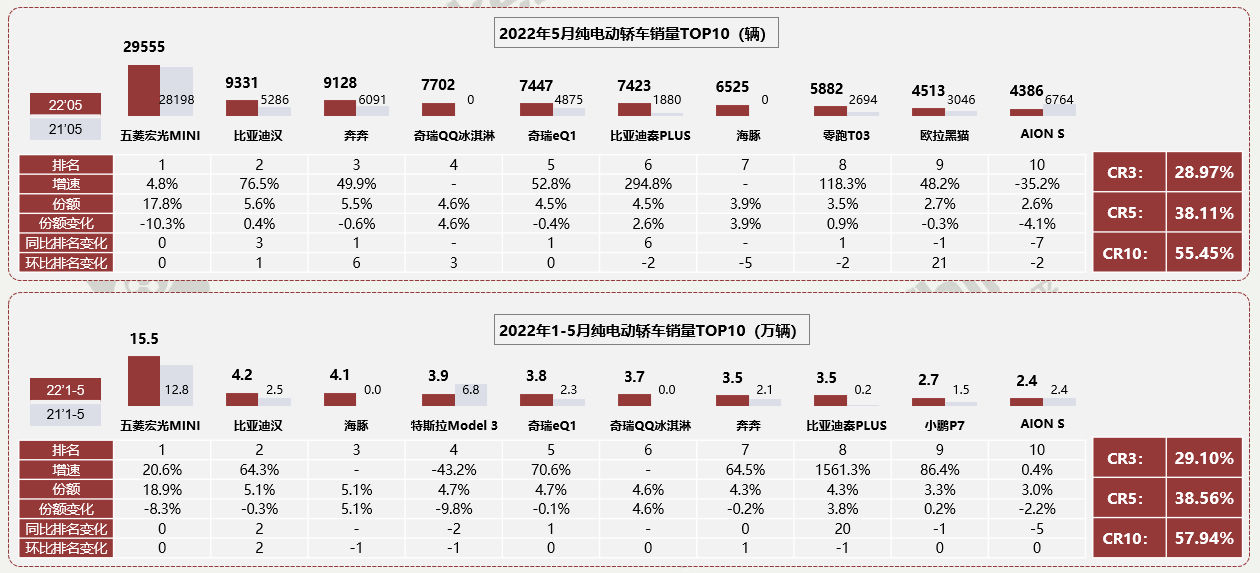 2022年5月纯电动轿车TOP10车型,宏光MINI、汉、奔奔排名前三,其中宏光MINI销售3.0万辆,同比增长4.8%。