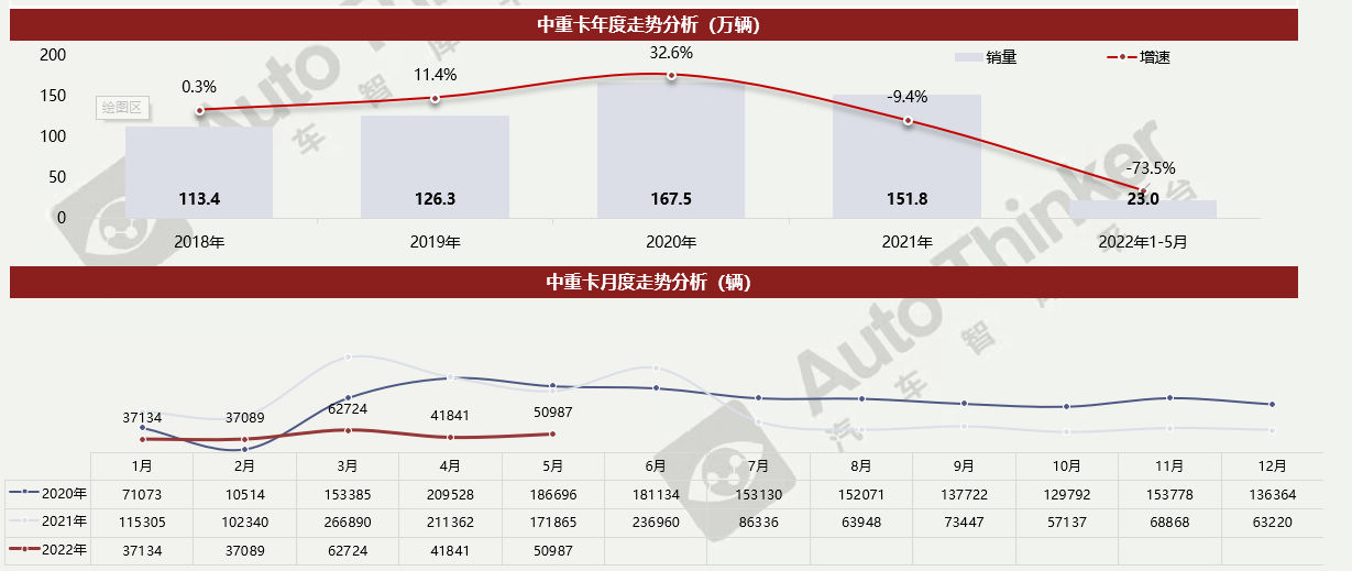 2022年5月,中重卡市场销售5.1万辆,同比下降70.3%;2022年1-5月,中重卡市场销售23万辆,同比下降73.5%。