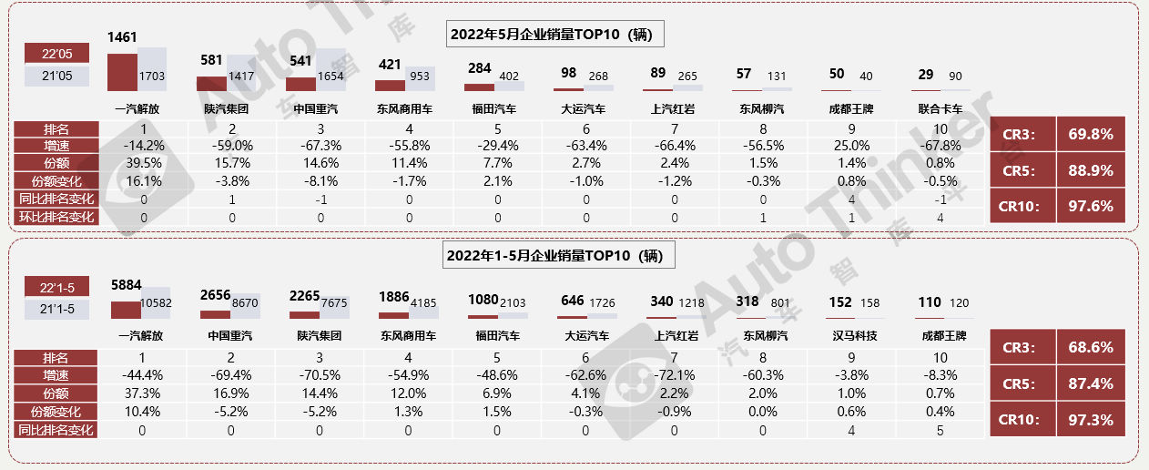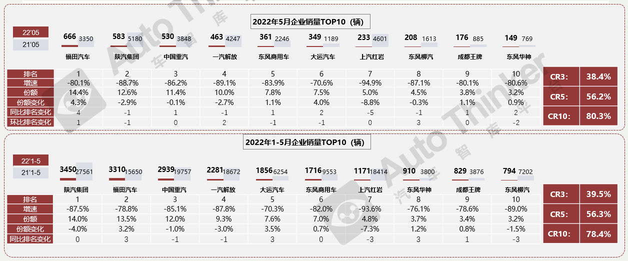 2022年5月,自卸车市场福田汽车、陕汽集团、中国重汽销量占据前三名,其中福田汽车销量达到666辆,同比下降80.1%;2022年1-5月,自卸车市场陕汽集团、福田汽车、中国重汽销量占据前三名,其中陕汽集团销量达到3450辆,同比下降87.5%。