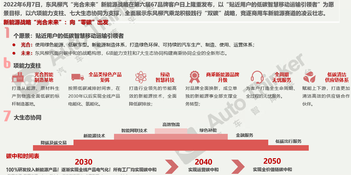 2022年6月7日,东风柳汽“光合未来”新能源战略在第六届67品牌客户日上隆重发布,以“贴近用户的低碳智慧移动运输引领者”为愿景目标,以六项能力支柱、七大生态协同为支撑,全面展示东风柳汽乘龙积极践行“双碳”战略,竞逐商用车新能源赛道的凌云壮志。