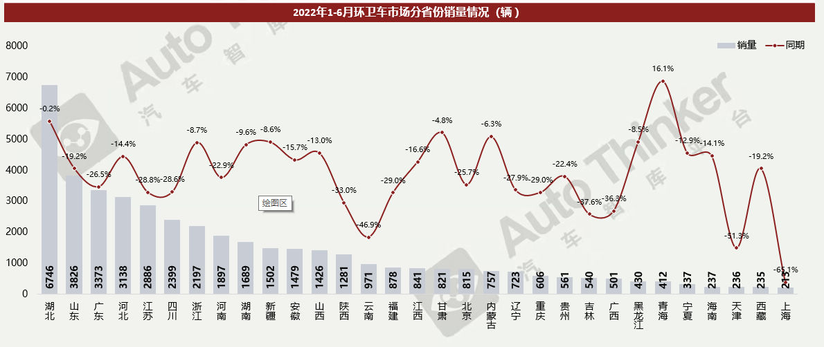 2022年1-6月,所有省份中湖北、山东、广东排在前三名,其中湖北累计销量6746辆,同比下降0.2%。