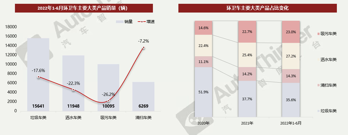 2022年1-6月,环卫车主要以垃圾车类为主,累计销量15641辆,同比下降17.6%;占据市场35.6%的份额,下降2.1个百分点。