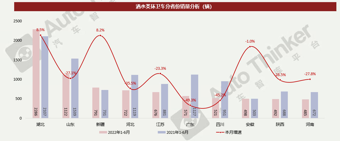 2022年1-6月,洒水车类环卫车省份分布中湖北、山东、新疆占据前三名,其中湖北累计销量2286辆,同比增长8.5%;占据市场份额19.1%,增长5.4个百分点。