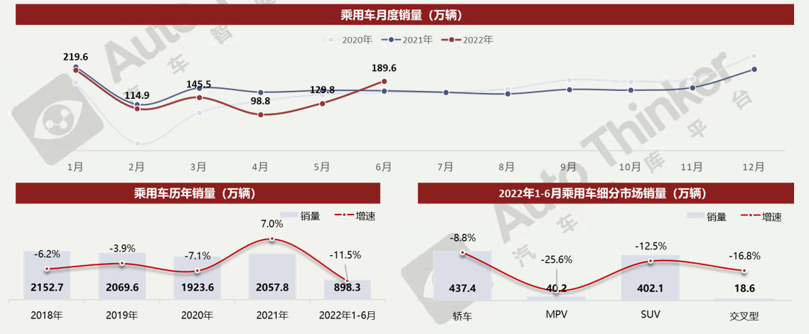 2022年6月,乘用车销售189.6万辆,同比增长15.7%;2022年1-6月,乘用车销售898.3万辆,同比下降11.5%;