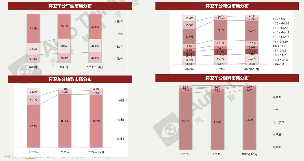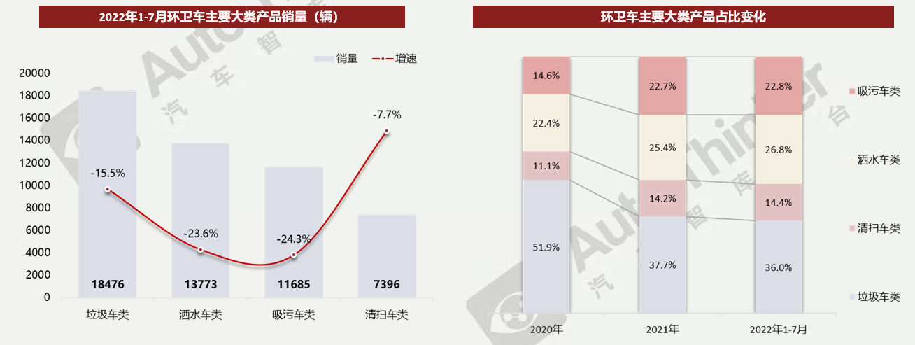 2022年1-7月,环卫车主要以垃圾车类为主,累计销量18476辆,同比下降15.5%;占据市场36%的份额,下降1.7个百分点。
