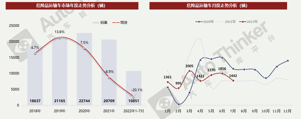 2022年7月,危险品运输车市场销售1442辆,同比增长3.3%; 2022年1-7月,危险品运输车市场累计销售10851辆,同比下降20.1%。
