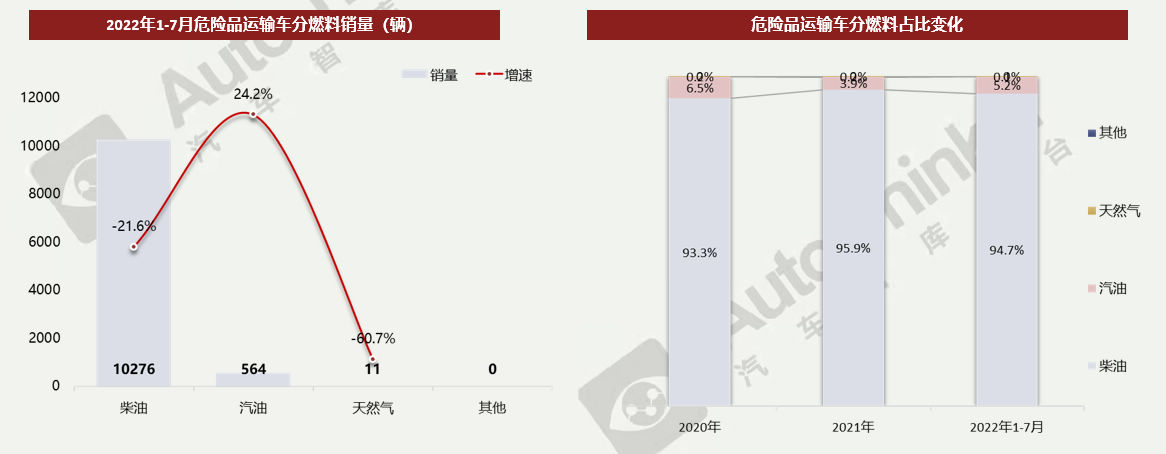 2022年1-7月,燃料结构方面主要为柴油机,累计销售10276辆,同比下降21.6%,占据市场94.7%的份额。