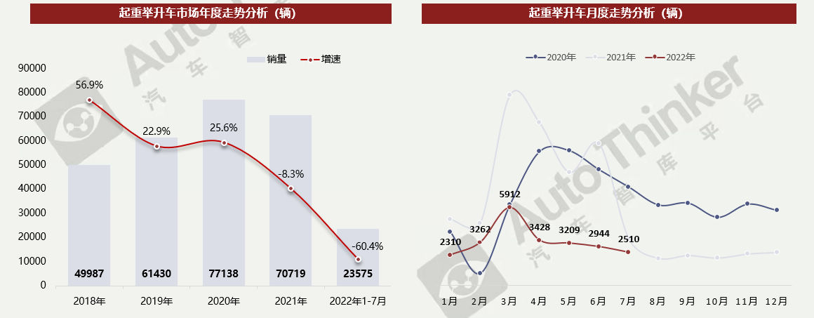 2022年1-7月,起重举升车市场累计销售23575辆,同比下降60.4%。