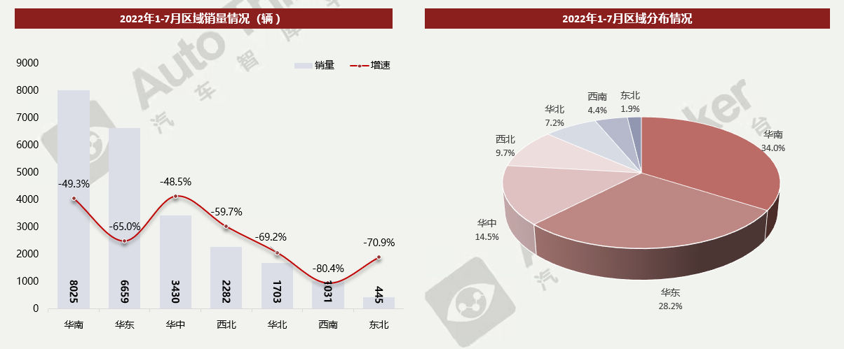 2022年1-7月,起重举升车销量主要分布在华南地区,累计销售8025辆,同比下降49.3%,占据市场34%的份额。