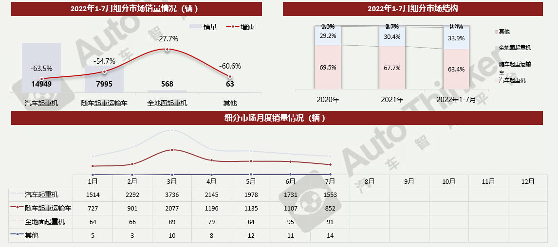 2022年1-7月,车型结构方面主要以汽车起重机为主,累计销售14949辆,同比下降63.5%,占据市场63.4%的份额。