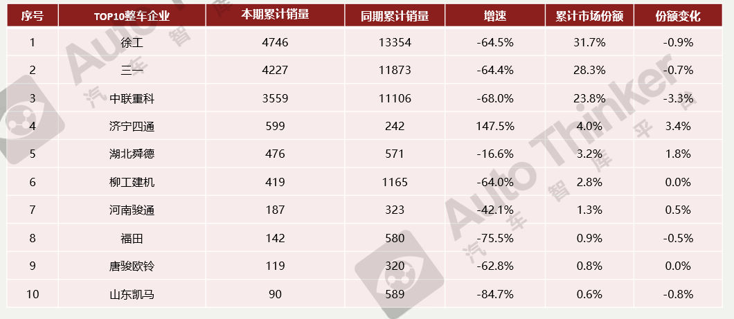 2022年1-7月,汽车起重车TOP10整车企业中徐工、三一、中联重科销量占据前三名,其中徐工累计销售4746辆,同比下降64.5%,占据市场31.7%的份额。