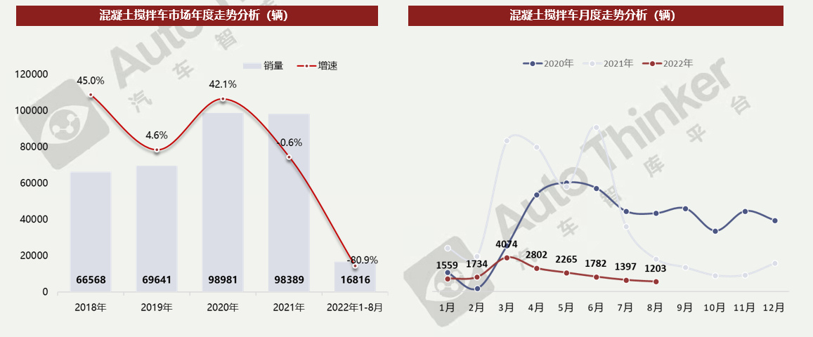 2022年8月,混凝土搅拌车市场销售1203辆,同比下降69.1%;