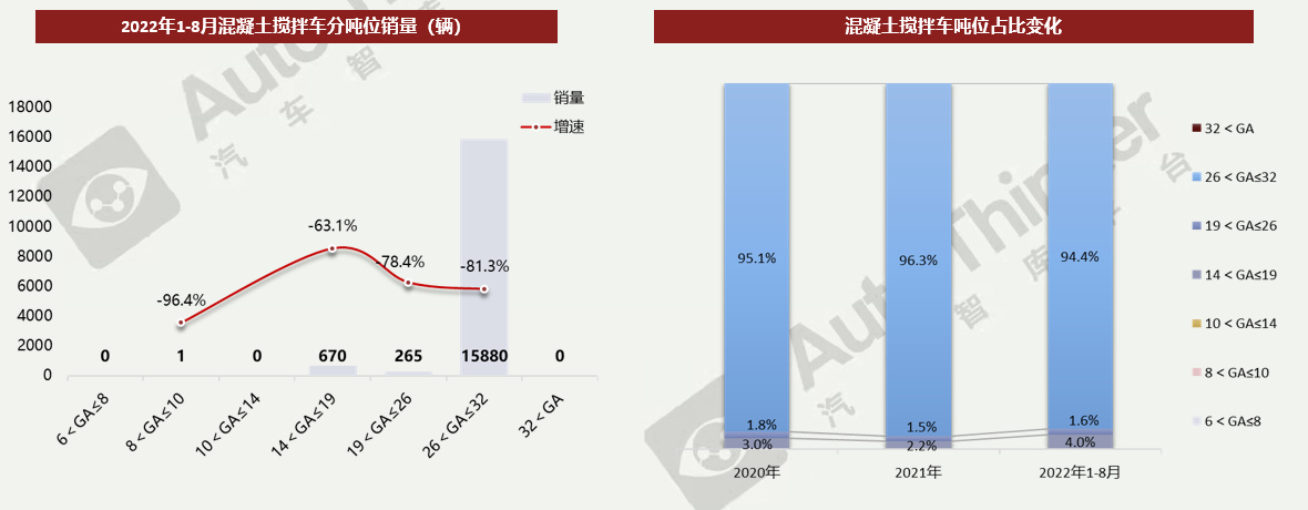 2022年1-8月,吨位结构方面主要集中在26<GA≤32吨位,累计销售15880辆,同比下降81.3%,占据市场94.4%的份额。
