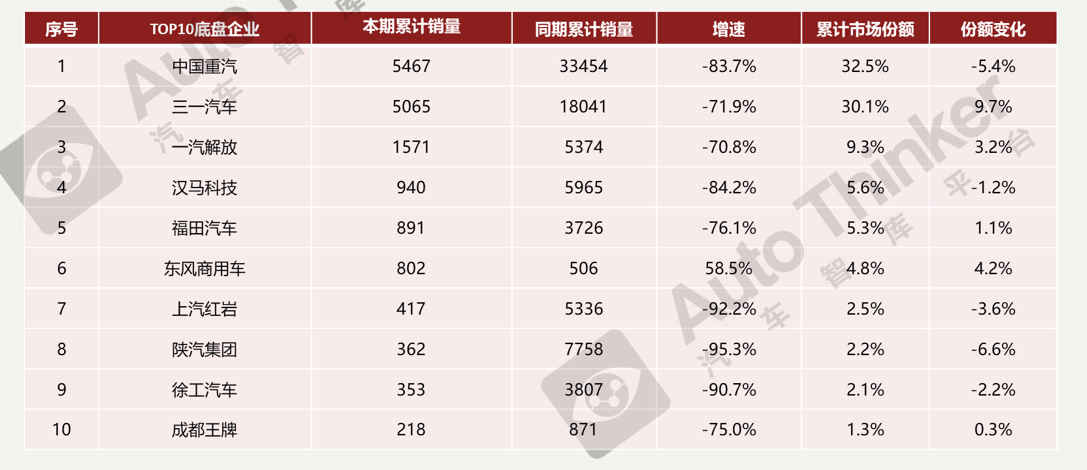 2022年1-8月,TOP10底盘企业中中国重汽、三一汽车、一汽解放销量占据前三名,其中中国重汽累计销售5467辆,同比下降83.7%,占据市场32.5%的份额。