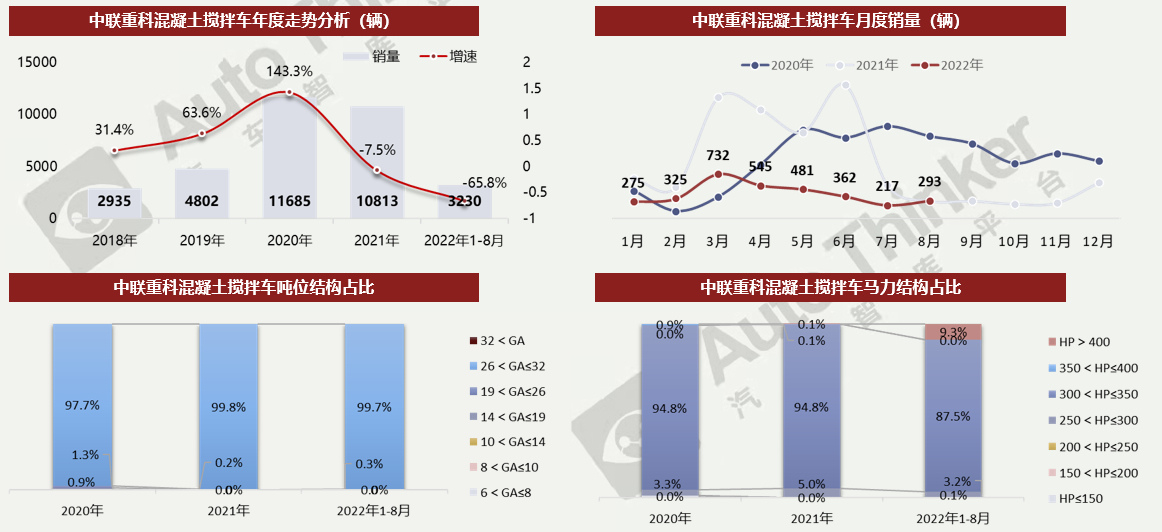 2022年1-8月,中联重科累计销售3230辆,同比下降65.8%;