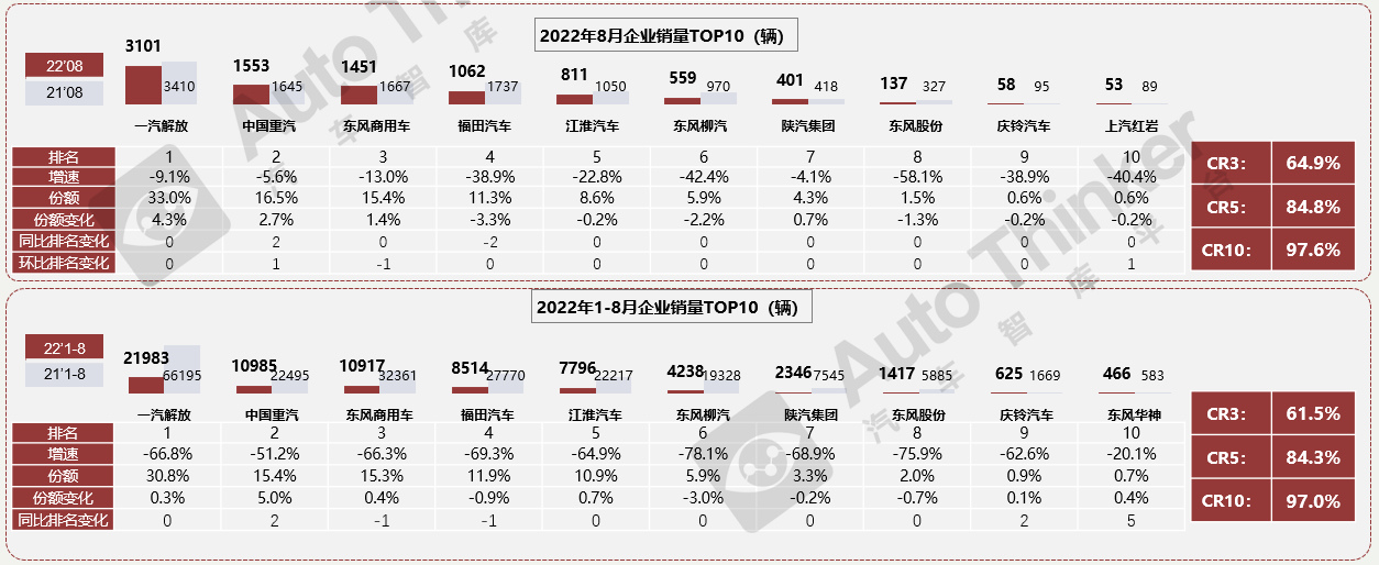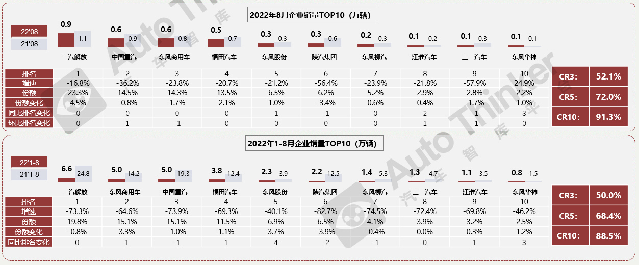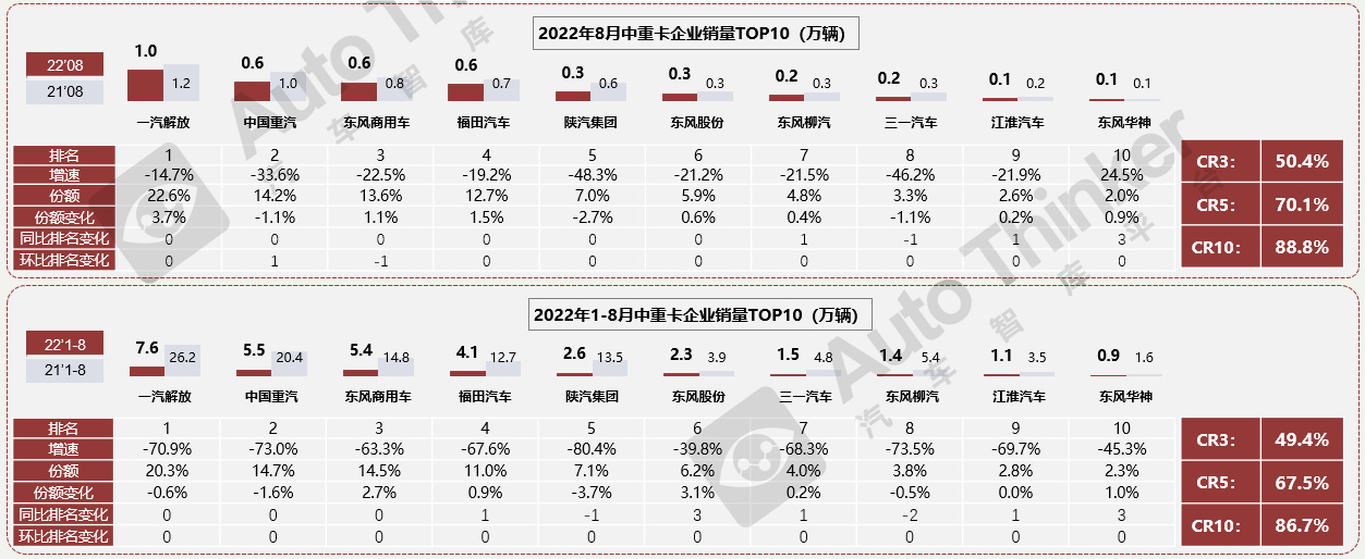 销量月报2022年8月,中重卡市场一汽解放、中国重汽、东风商用车销量占据前三名,其中一汽解放销量达到1万辆,同比下降14.7%。