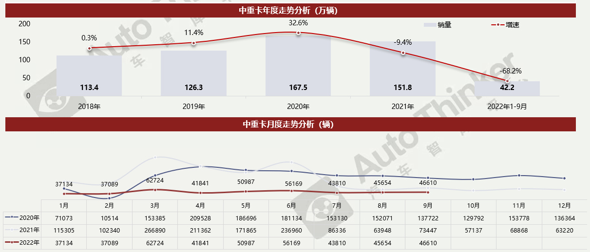 2022年9月,中重卡市场销售4.7万辆,同比下降36.5%;2022年1-9月,中重卡市场销售42.2万辆,同比下降68.2%。