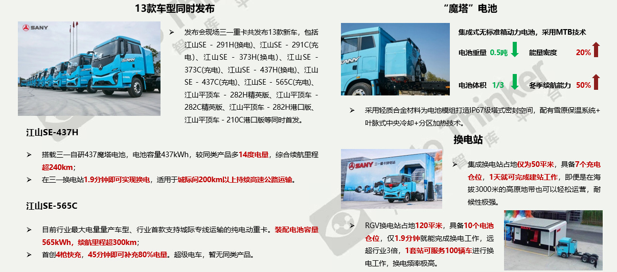 9月23日,三一重卡电动化2.0新品线上发布会,在三一智联重卡产业园召开。三一重卡集中发布13款电动牵引车产品、2座换电站及“魔塔”电池,向全行业展示三一新能源整体解决方案。
