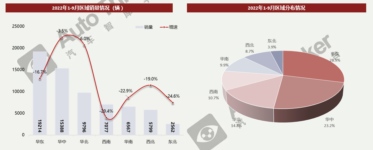 2022年1-9月,环卫车销量主要分布在华东地区,累计销售19214辆,同比下降16.7%,占据市场28.9%的份额。