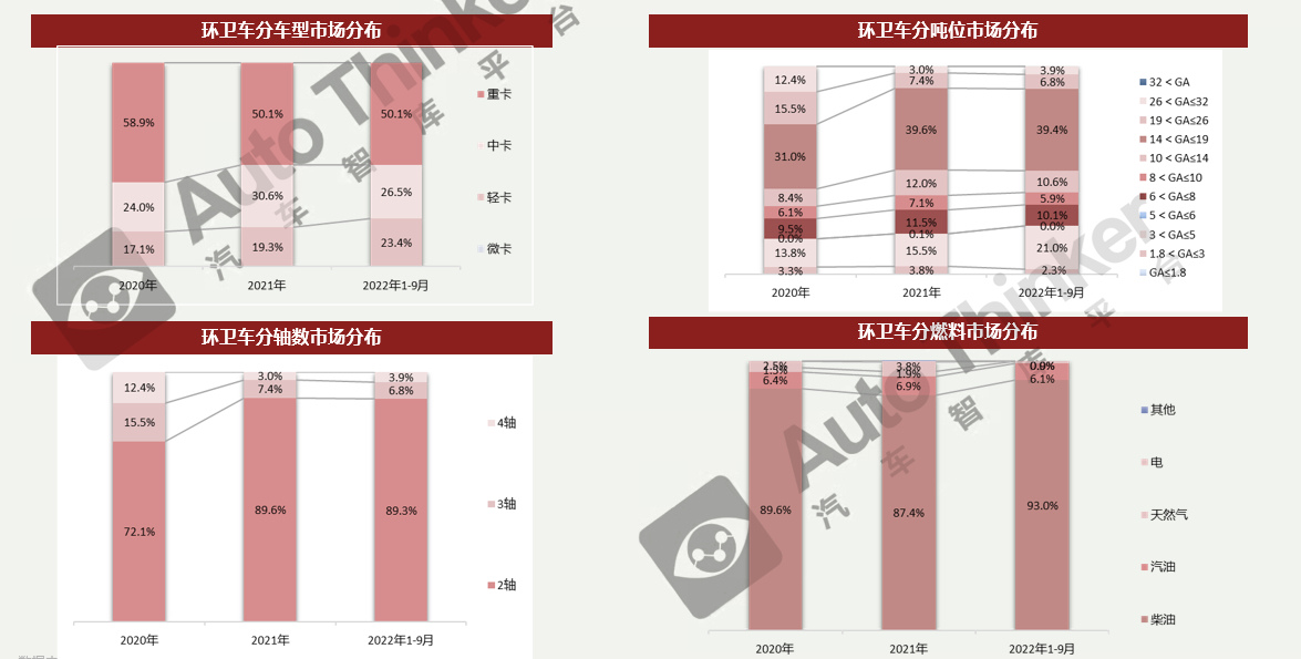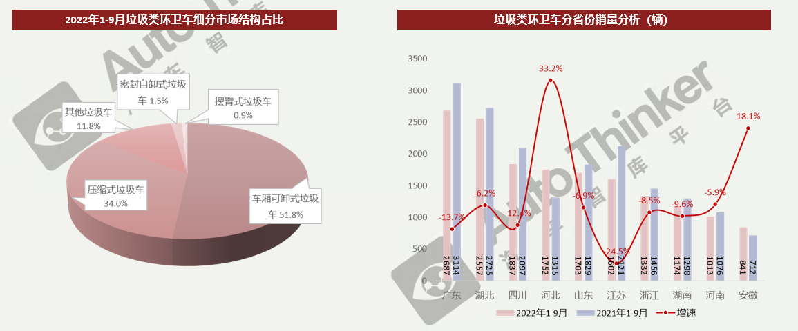 2022年1-9月,垃圾环卫车细分车型主要以车厢可卸式垃圾车为主,累计销量12971辆,同比增长0.7%;占据市场份额51.8%,增长6个百分点。