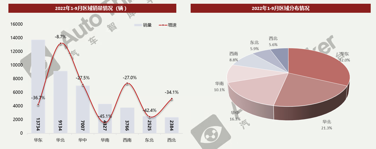2022年1-9月,冷藏保温车销量主要分布在华东地区,累计销售13734辆,同比下降36.7%,占据市场32%的份额。