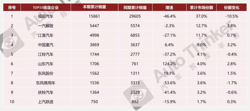 2022年1-9月,TOP10底盘企业中福田汽车、一汽解放、江淮汽车销量占据前三名,其中福田汽车累计销售15861辆,同比下降46.4%,占据市场37%的份额。