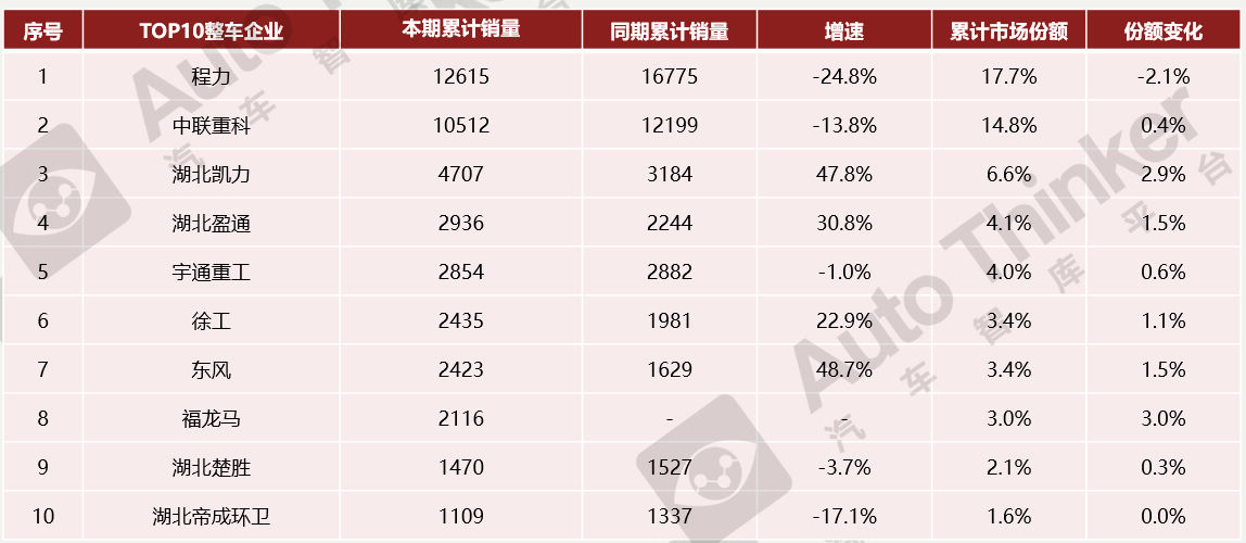 2022年1-10月,TOP10整车企业中程力、中联重科、湖北凯力排在前三名,其中程力累计销量12615辆,同比下降24.8%;占据市场份额17.7%,下降2.1个百分点。