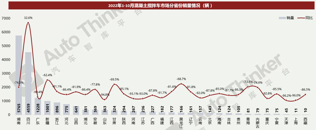 2022年1-10月,所有省份中湖南、四川、广东销量排在前三名,其中湖南累计销售5765辆,同比下降74.5%。