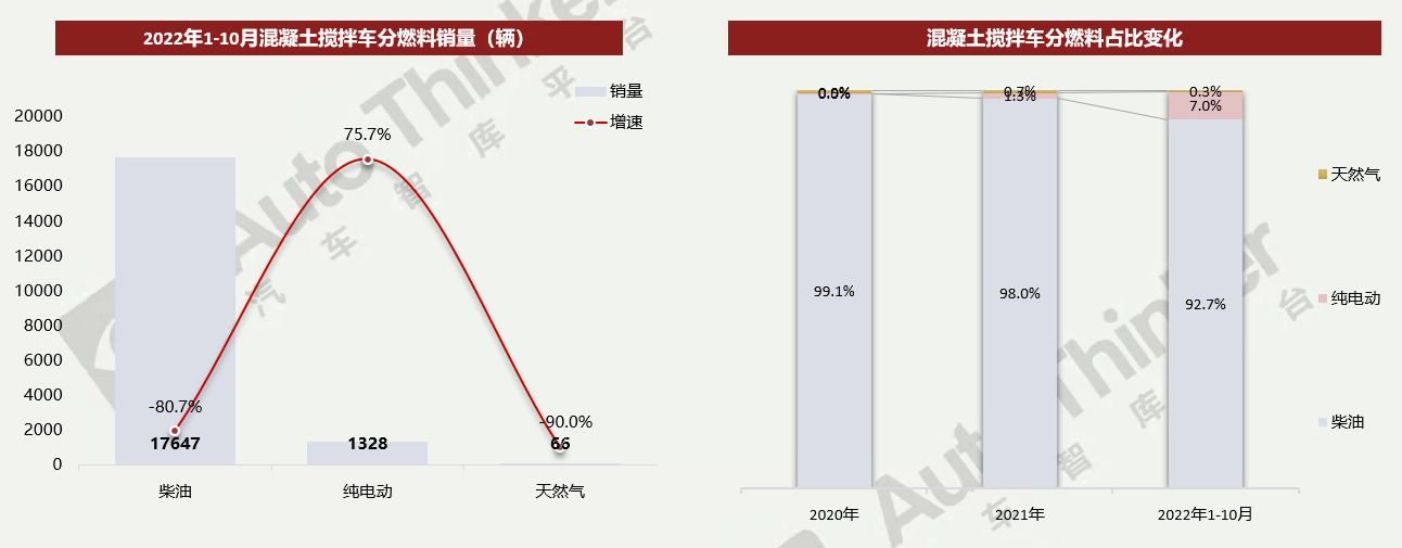 2022年1-10月,燃料结构方面主要集中在柴油机,累计销售17647辆,同比下降80.7%,占据市场92.7%的份额,下降5.3个百分点。
