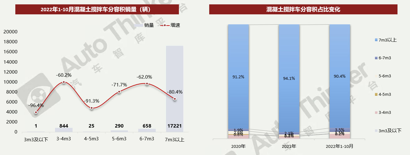 2022年1-10月,搅拌容量方面主要集中在7m3以上容量,累计销售17221辆,同比下降80.4%;占据市场90.4%的份额,下降3.6个百分点。