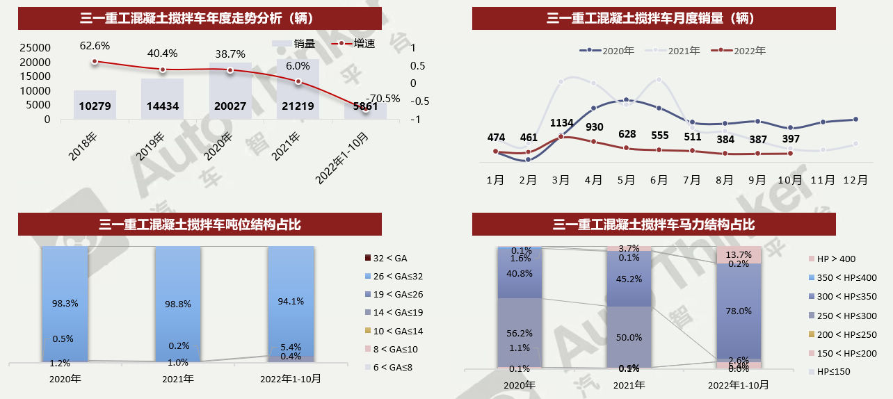 销量月报2022年10月,混凝土搅拌车市场销售1158辆,同比下降40.2%; 2022年1-10月,混凝土搅拌车市场累计销售19041辆,同比下降79.5%。