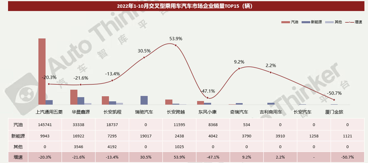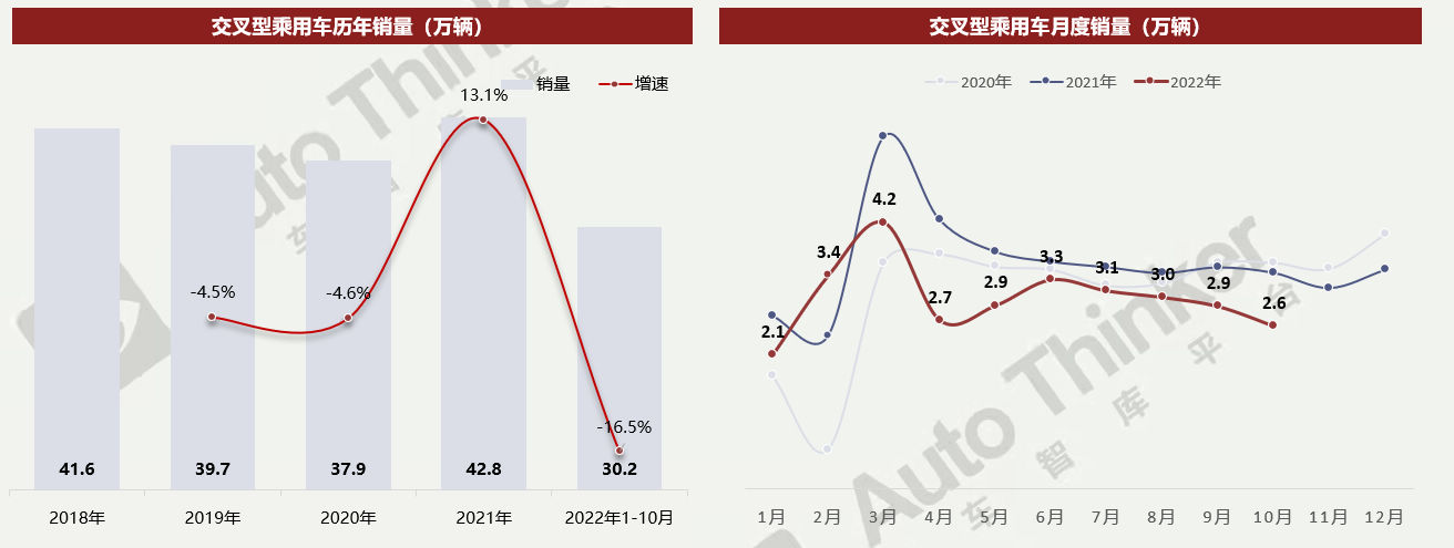 2022年10月,交叉型乘用车销量2.6万辆,同比下降24.7%;2022年1-10月,交叉型乘用车销量30.2万辆,同比下降16.5%。