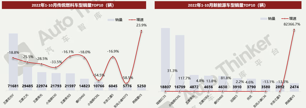 2022年1-10月,传统燃料车:五菱宏光V销售71681辆,同比下降18.8%;五菱之光销售29485辆,同比下降25.5%;五菱荣光销售22974辆,同比下降28.5%。