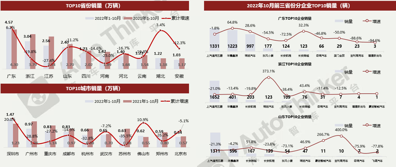 2022年1-10月,广东销售4.6万辆,同比增长6.2%;浙江销售3万辆,同比下降19.8%;江苏销售2.6万辆,同比下降27.4%;