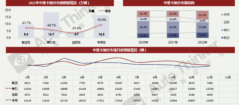2022年1-11月,牵引车销量占据第一位,销量达到18.7万辆,同比下降69.7%。
