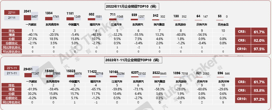 2022年1-11月,载货车市场一汽解放、东风商用车、中国重汽销量占据前三名,其中一汽解放销量达到29451辆,同比下降61.9%;