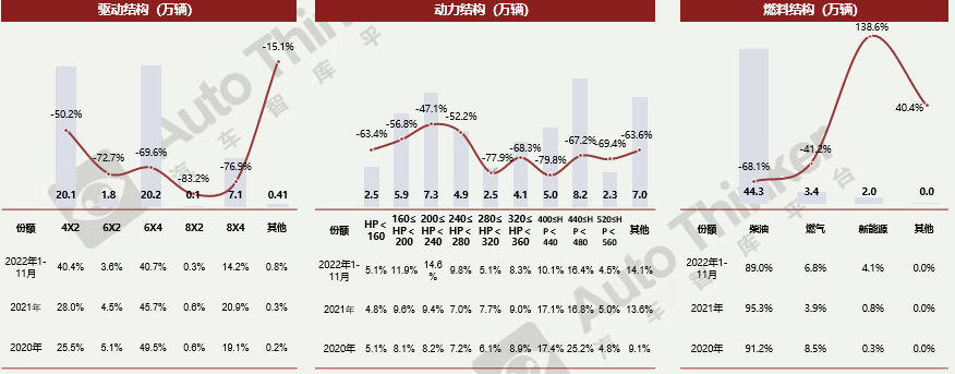 2022年1-11月,驱动结构方面6×4销量占据第一位,销量达到20.2万辆,同比下降69.6%;