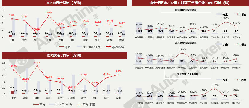 2022年11月,中重卡市场TOP10省份中山东、江苏、河北销量占据前三名,其中山东销量达到4314辆,同比增长1%;