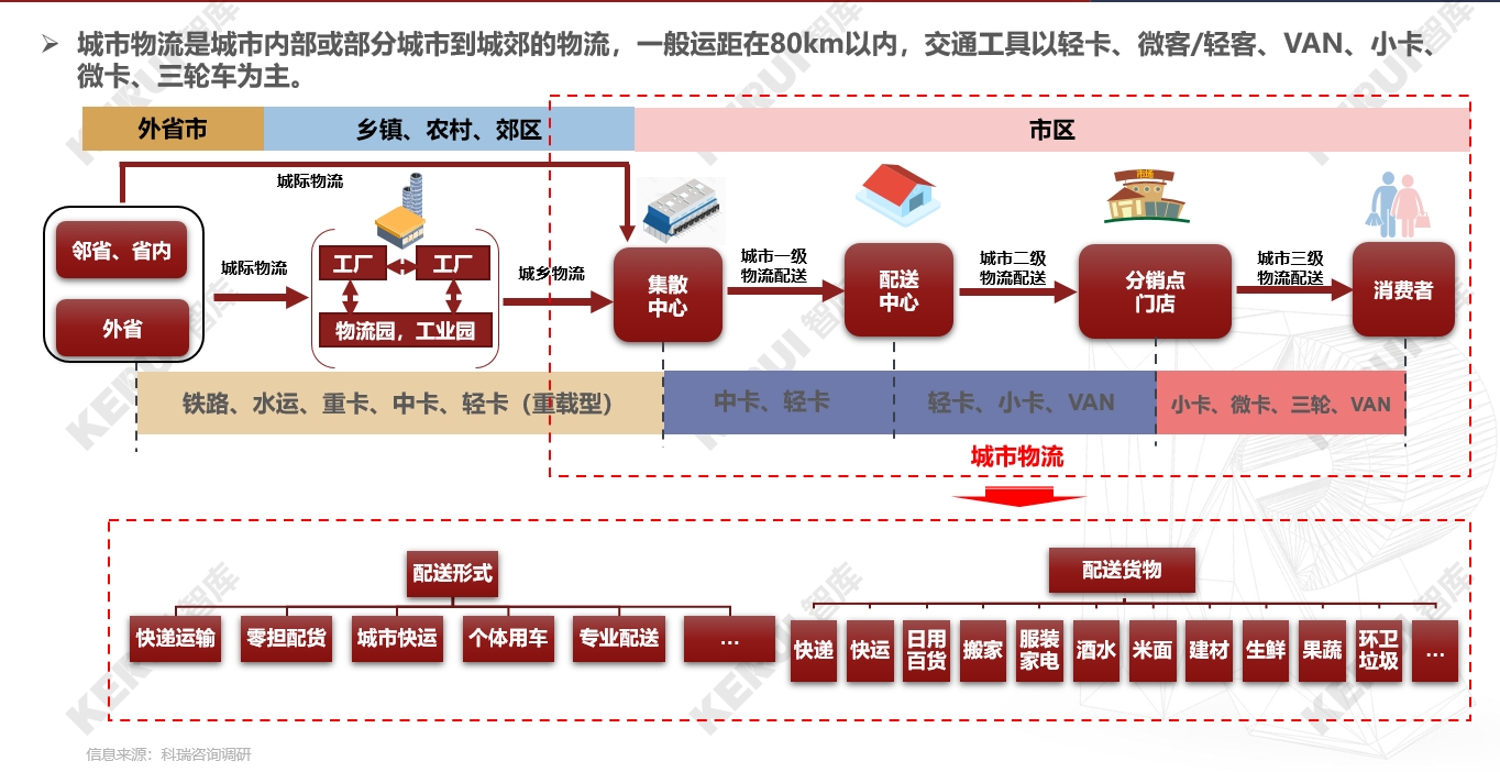 城市物流:是以城市为主体,围绕城市需求所发生的物流活动;是在国际物流、区域物流后,将商品交付使用者的最后一环物流。 根据公司及货物的性质,城市物流车辆的用户可分为:快递公司、商超/快消品配送、平台公司,以及散户/自用四大类;根据配送形式的不同,又可将城市物流分为快递运输、零担配货、城市快运、个体用车和专业配送这五类。展开