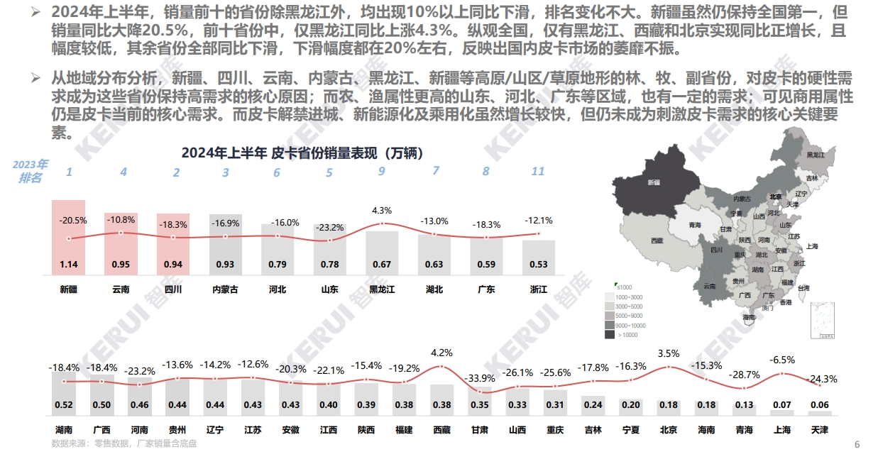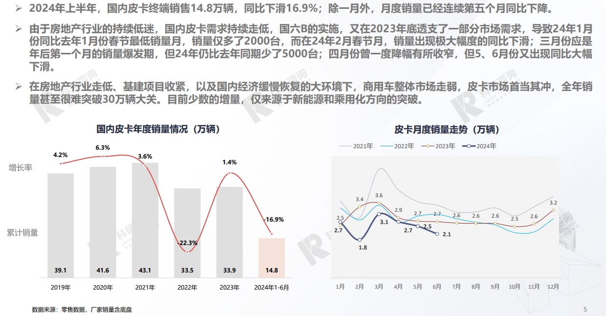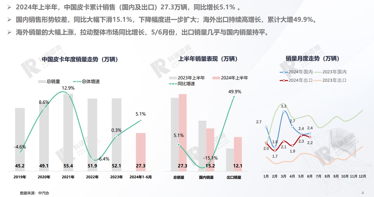 2024年上半年,中国皮卡累计销售(国内及出口)27.3万辆,同比增长5.1% 。 国内销售形势较差,同比大幅下滑15.1%,下降幅度进一步扩大;海外出口持续高增长,累计大增49.9%。 海外销量的大幅上涨,拉动整体市场同比增长,5/6月份,出口销量几乎与国内销量持平。展开
