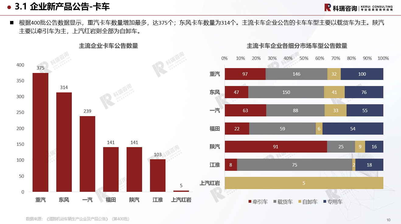 根据400批公告数据显示,重汽卡车数量增加最多,达375个;东风卡车数量为314个。主流卡车企业公告的卡车车型主要以载货车为主。陕汽主要以牵引车为主,上汽红岩则全部为自卸车。展开