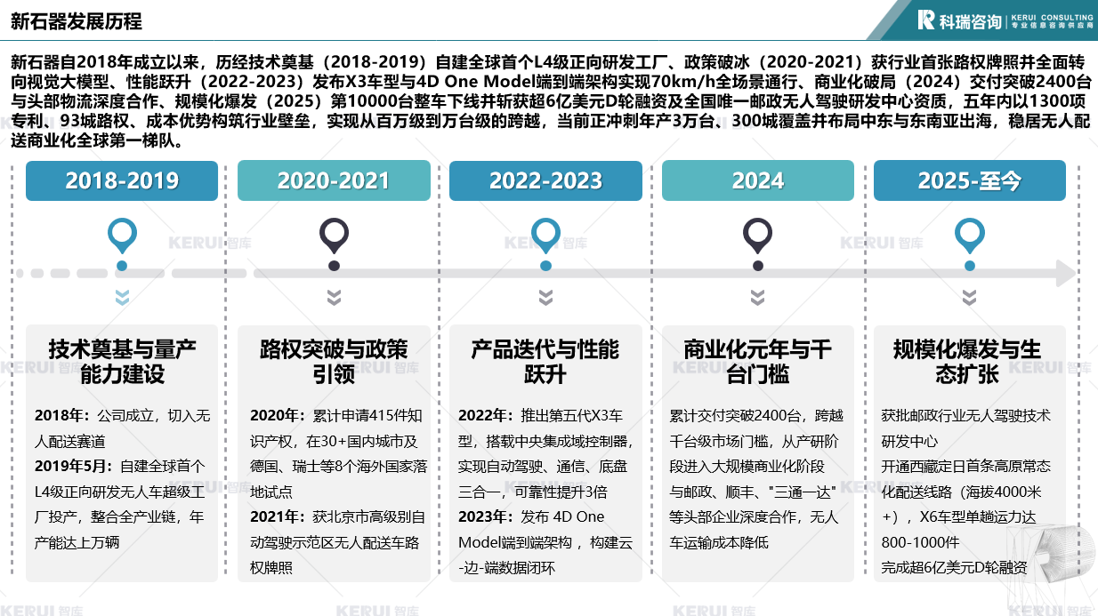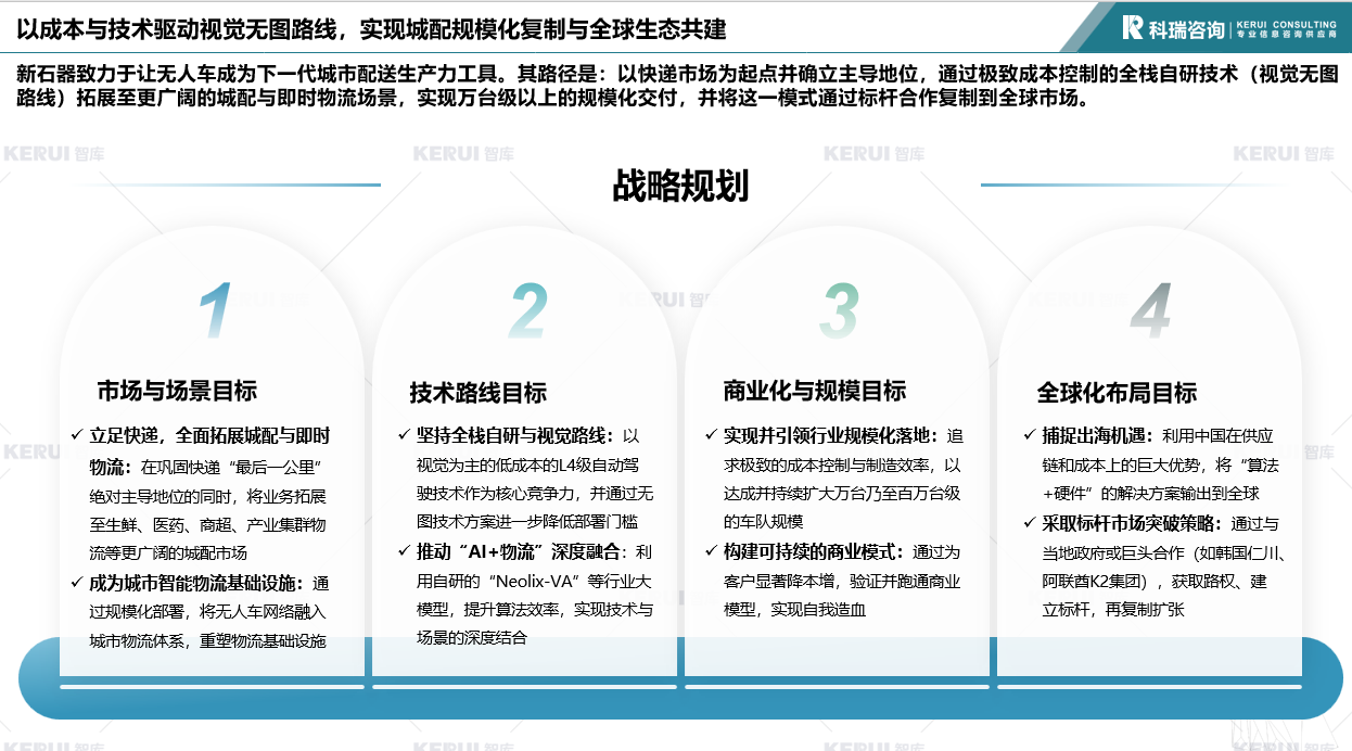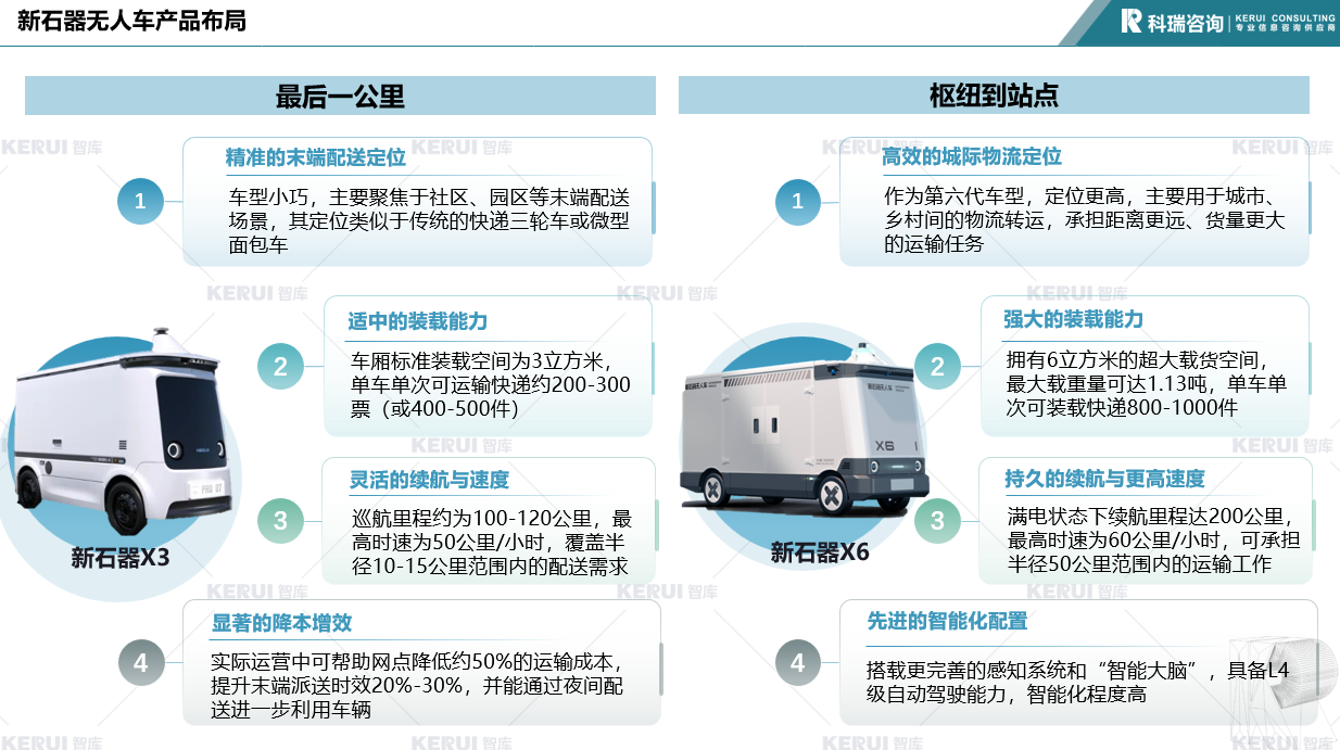 新石器无人车的核心竞争优势在于构建了“技术驱动、网络协同、产品矩阵”三位一体的闭环体系:在智能化上,其搭载自研L4级自动驾驶系统与全球首个货运行业“视觉-动作”大模型Neolix-VA,并通过无图技术方案显著降低了硬件成本与部署门槛;在服务网络上,其车辆已规模化落地,覆盖全球300多个城市,形成了深度渗透的运营与服务能力展开
