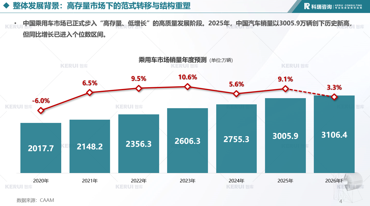 中国乘用车市场已正式步入“高存量、低增长”的高质量发展阶段。2025年,中国乘用车销量以3005.9万辆创下历史新高,但同比增长已进入个位数区间。市场驱动力发生根本性转移,2026年预计销超过3100万辆,市场趋于平稳发展。展开